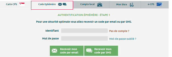 Cliquez sur l’onglet « Code éphémère » et renseignez votre identifiant et votre mot de passe habituel. Un code d’accès à usage unique vous sera envoyé par mail ou par sms, en cliquant sur l’option de votre choix, pour vérifier votre identité.