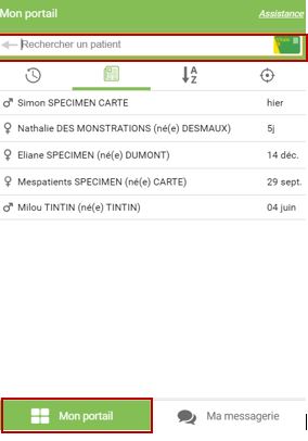 Vous pouvez accéder au dossier du patient, si vous êtes habilité en saisissant le nom et prénom du patient ou en lisant sa carte vitale, depuis l’onglet « Mon portail »